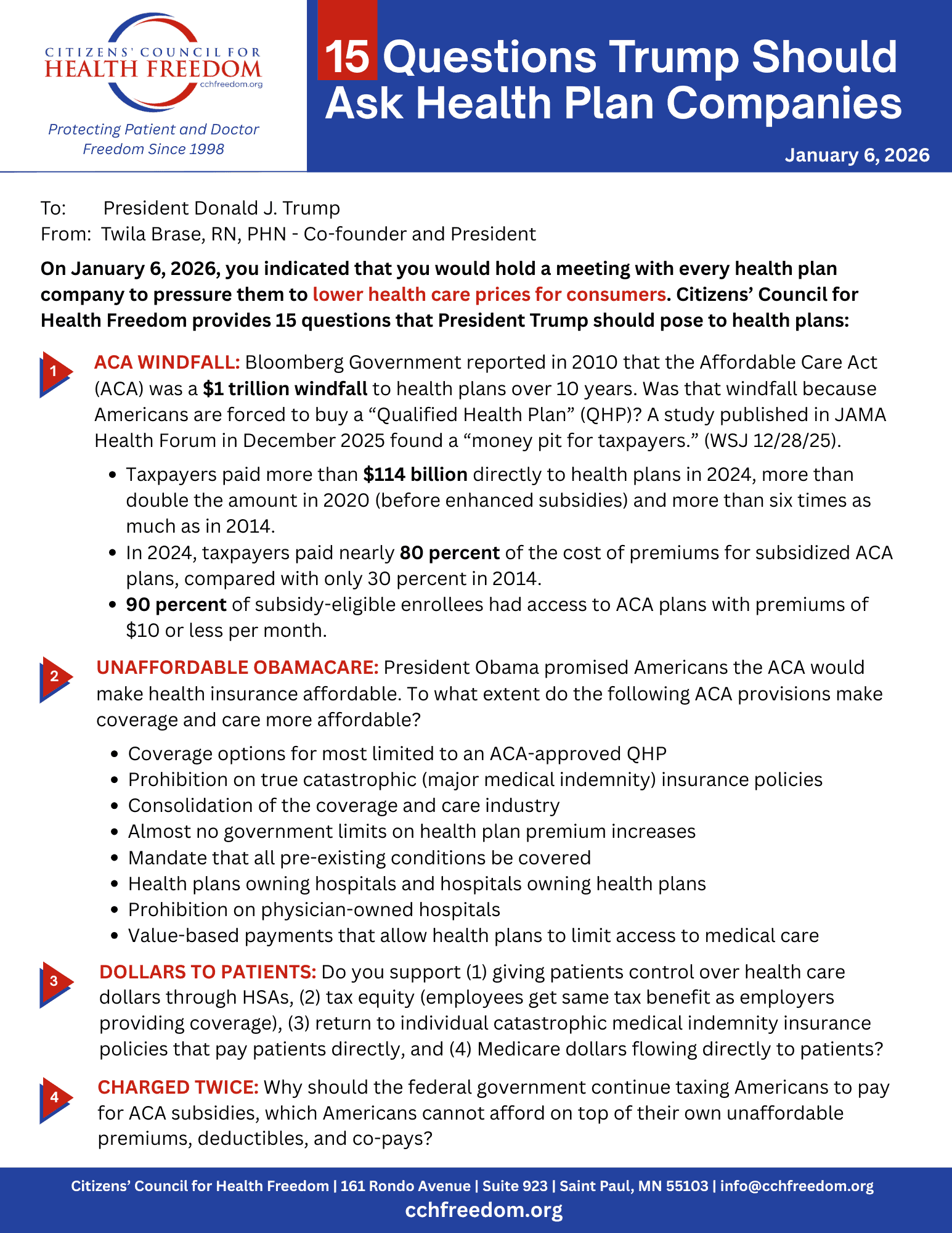 Letter includes attached list of 12 recommendations and CCHF’s 3-C Solution for health care ST. PAUL, Minn. — Citizens’ Council for Health Freedom (CCHF) has asked President Trump to not extend the enhanced Obamacare subsidies. In a letter sent Thursday, December 4,...